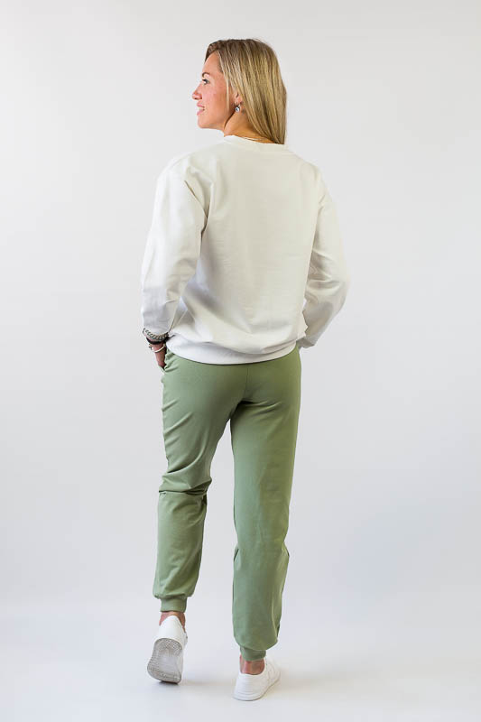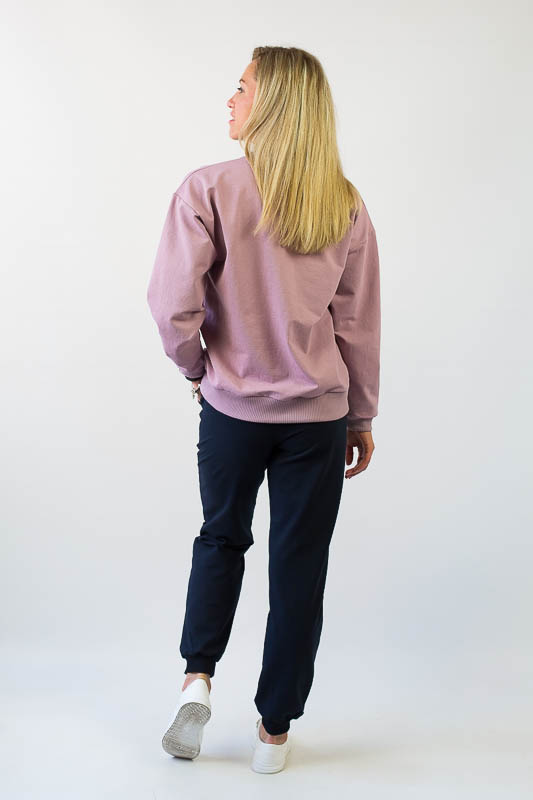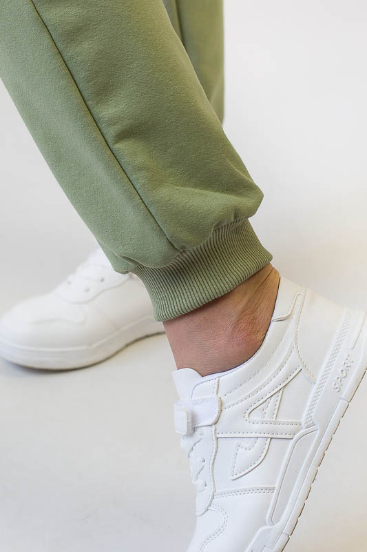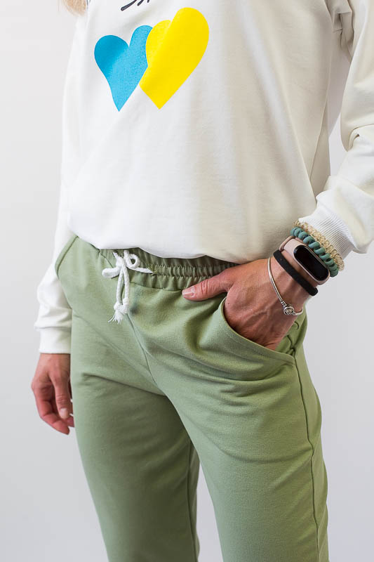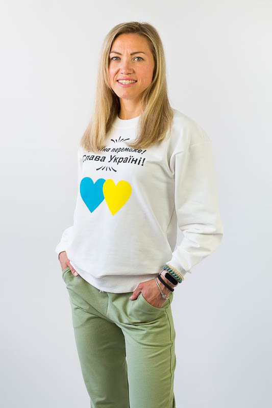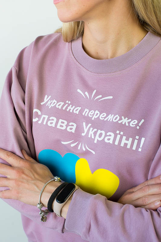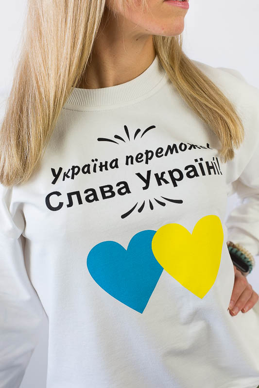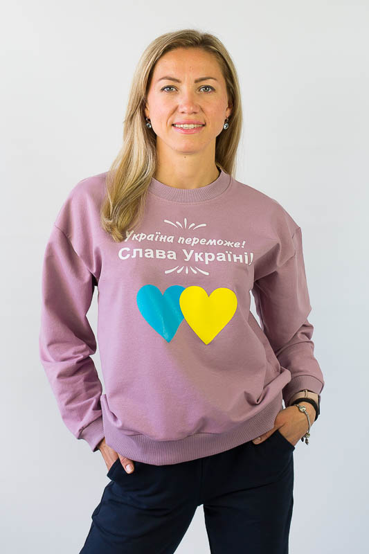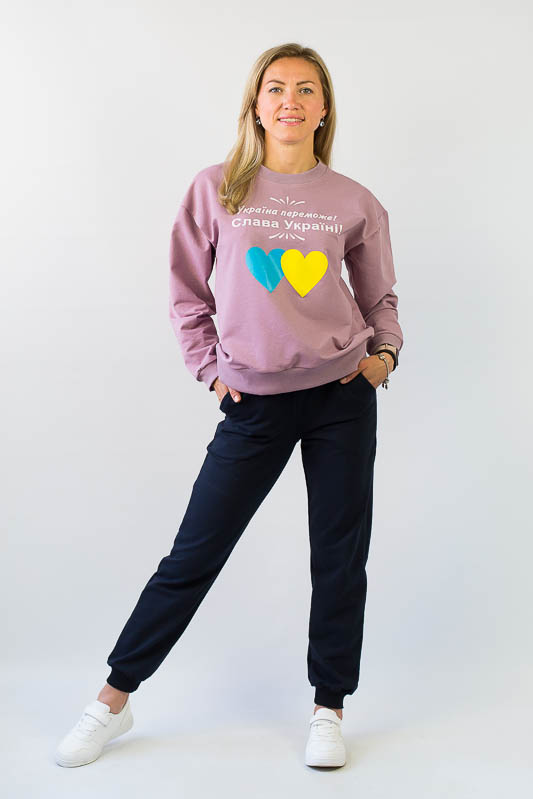 Для вечірніх прогулянок чи спортивних занять чудово підійде костюм, що складається зі штанів на манжетах та світшота. Світшот формату oversize відрізняється спущеною лінією плеча і прикрашений патріотичним малюнком. Рукава довгі, але по краю оформлені м'якою манжетою-резинкою, що дозволяє регулювати довжину на свій розсуд. Штани по боках мають місткі кишені. Широка відстрочена резинка на талії доповнена шнуром. Костюм виготовлений із комбінації кольорів, що дозволяє поєднувати його елементи з іншими предметами гардеробу. Виготовлено модель із трикотажного полотна – двунитка (95% бавовна, 5% еластан). Матеріал має позитивні споживчі якості: добре вбирає вологу; ефективно пропускає повітря; не утворює пилок (ковтунів); не витягується при носінні; простий у догляді. Костюм слід прати у теплій воді. Температури води, що дорівнює 30°С, буде достатньо для якісного прання матеріалу.