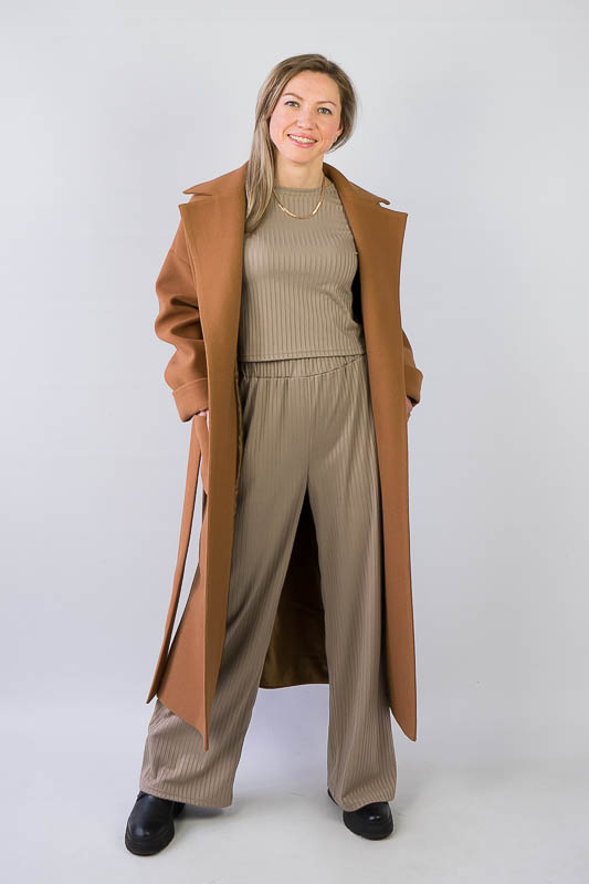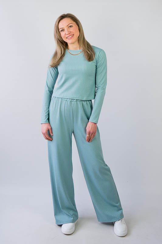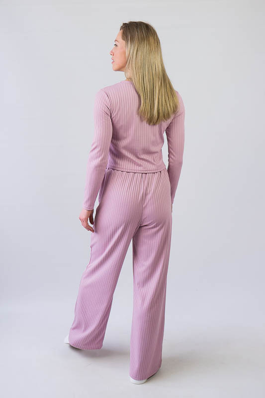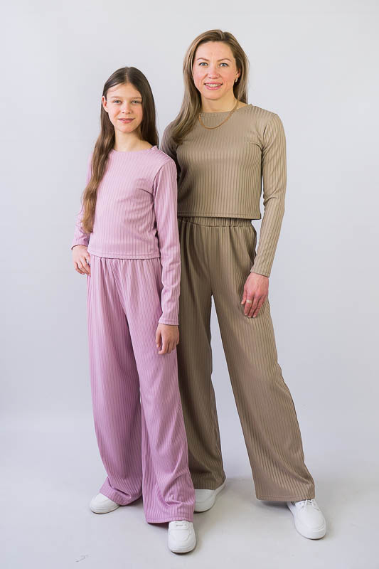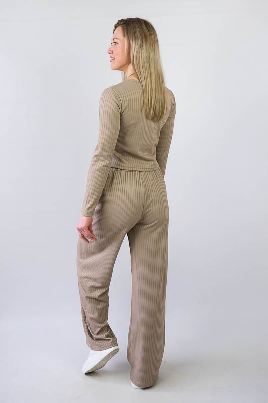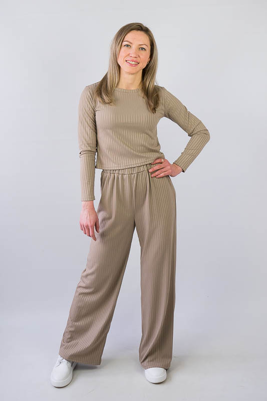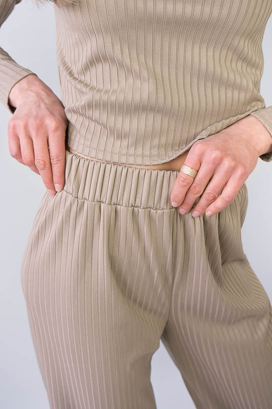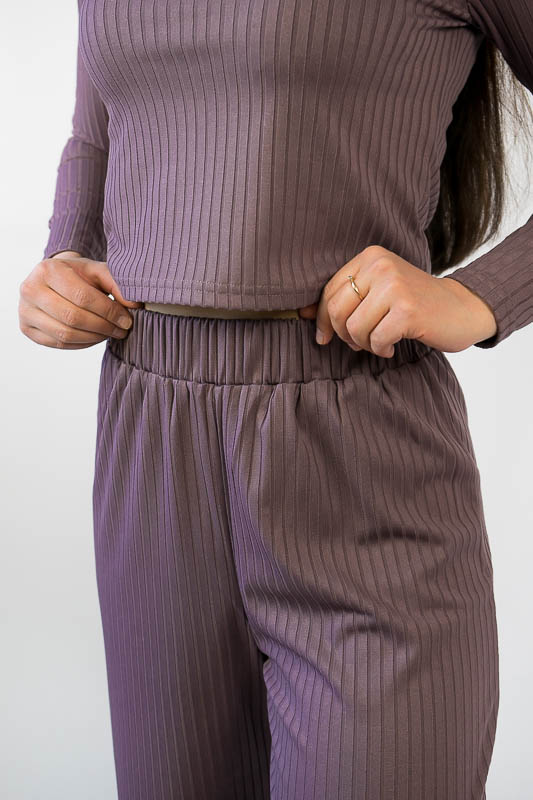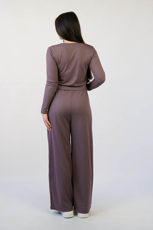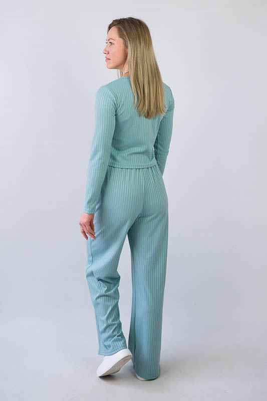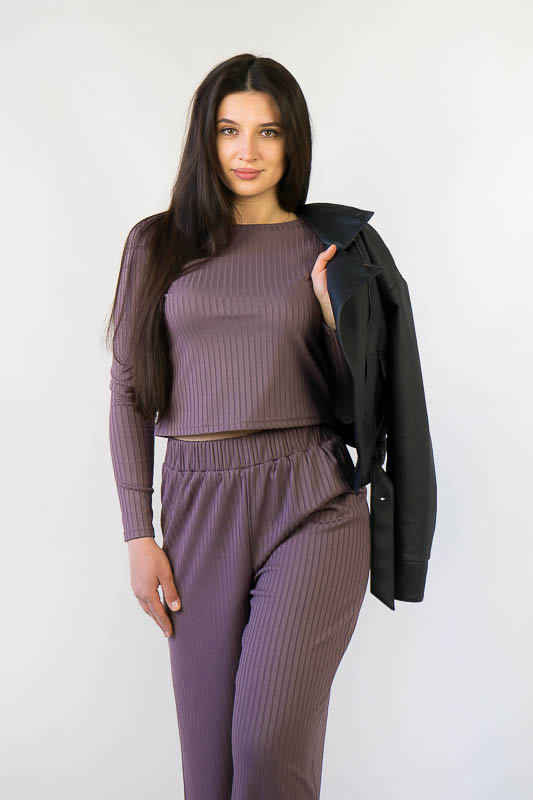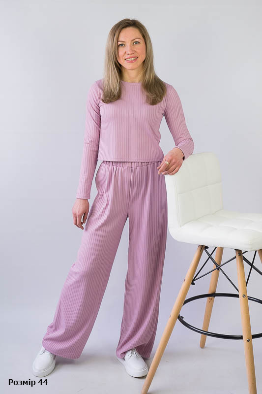 Жіночий комплект від ТМ «Гном» подарує вам відчуття комфорту та зручності. Складається він з укороченого лонгсліву та широких прямих штанів. Виготовлений комплект з м’якого трикотажу мустанг, (74% поліестер, 22% віскоза, 4% еластан), який є стрейчевим полотном у вигляді "гумки", тобто чергування лицьових і виворітних рядів. Тканина приємна до тіла, не надто тонка. Підходить для пошиття топів, суконь, стильних трикотажних костюмів, кардиганів та ін. Прати вручну у воді не більше 30°C, сильно не віджимати, прасувати не обов’язково.