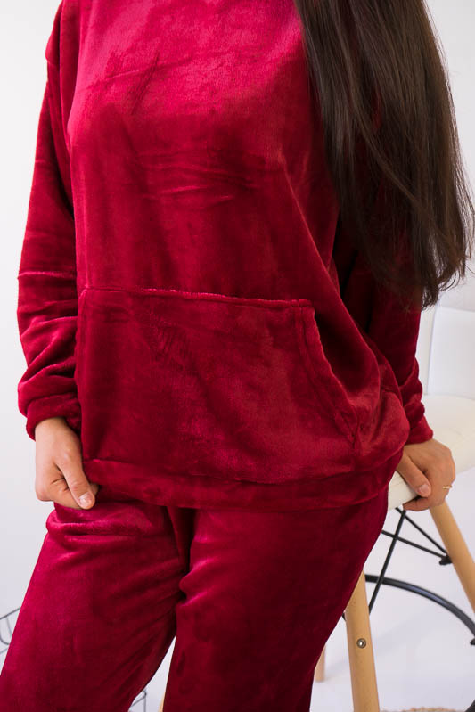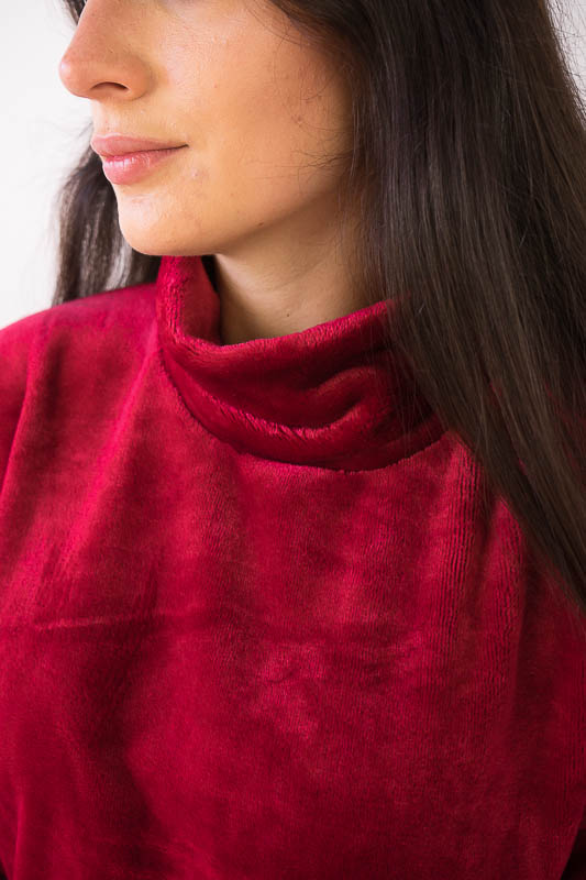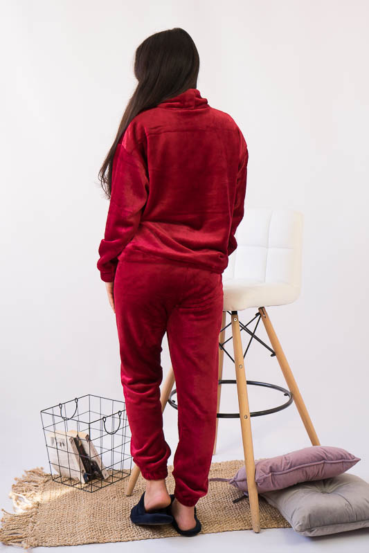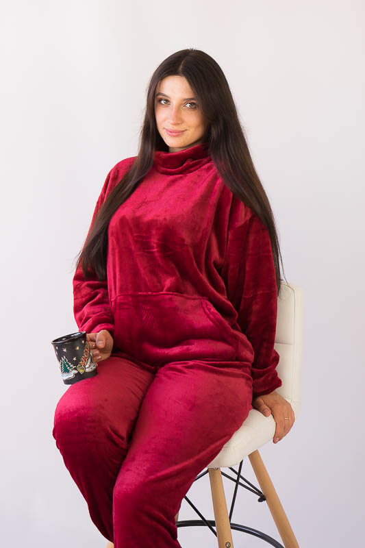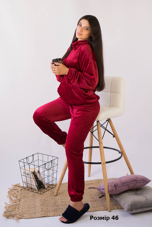 Зручний та комфортний жіночий костюм від ТМ»Гном» – це чудовий варіант домашнього одягу. Поєднання теплого м’якого матеріалу з вільним кроєм робить модель практичною та затишною. Костюм складається зі світшоту та штанів. Об'ємний світшот має високий комір та велику кишеню. Штани пошиті під еластичний манжет. Модель виготовлена з легкої махри або велсофту. Це трикотаж із густим та м'яким ворсом. Завдяки високій щільності ворсинок речі виходять дуже теплими, причому вироби зберігають свою форму навіть після численних прань і на них не утворюються ковтуни. При цьому матеріал дуже легкий, повітропроникний, гіпоалергенний. Вироби з велсофту не вимагають особливого догляду, вони не розтягуються і не сідають під дією високої температури та інших факторів, при пранні не линяє.