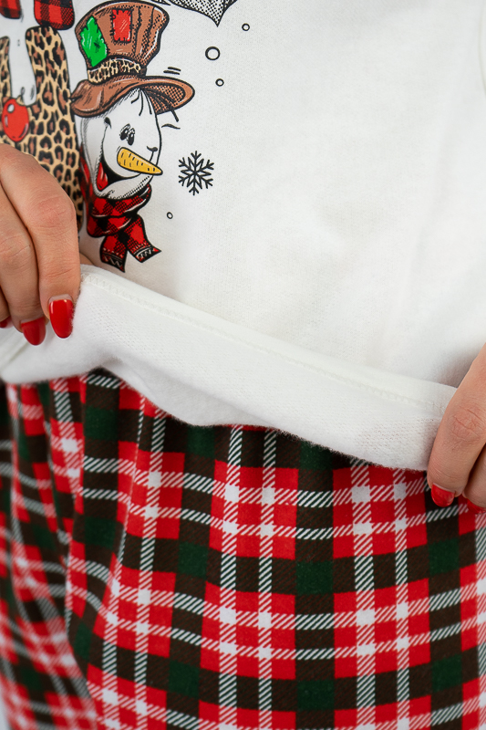 Тепла жіноча піжама із колекції "Family look" сприяє повноцінному відпочинку та приємному сну. Вільний крій та обробка еластичними манжетами забезпечать комфорт та зручність. Поєднання однотонного та принтованого в клітинку трикотажного полотна з додаванням яскравого малюнку створять приємний святковий настрій. Сімейну колекцію доповнять моделі арт. 150-300-1267Ч-1, 300-1267П-1 та 300-1267Д-1. Виготовлена піжама із начісного футера – матеріалу теплого та комфортного. Лицьова сторона такого полотна гладка і приємна, а з виворітного боку - теплий і м'який начос. Начос досить міцний, тому витримає будь-які навантаження, навіть найінтенсивніші рухи не викличуть зламів або складок на речах. Полотно стійке до появи затяжок та ковтунів. Вироби з такого матеріалу зручні, практичні та прослужать Вам дуже довго. Однак є деякі негативні моменти – матерія погано реагує на вплив прямих сонячних променів та високих температур під час прання. Тому, щоб виріб не дав усадку, прати його рекомендують за температури не вище 30°C. Прасувати треба з лицьової сторони.